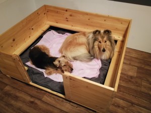 Die Welpen werden hier im Haus zur Welt kommen. Ihnen steht ein eigenes, liebevoll eingerichtetes Welpenzimmer mit einer gemütlichen Wurfbox zur Verfügung, in der sie in Ruhe groß und stark werden können. Wenn sie etwas älter sind, werden sie in einen Welpenauslauf im Wohnzimmer umziehen, damit sie sich schon früh an Alltagsgeräusche wie z.B. den Staubsauger, Küchengeräte, Waschmaschine oder Fernseher gewöhnen können. Sie werden also inmitten unseres Alltags und direkt bei uns aufwachsen.